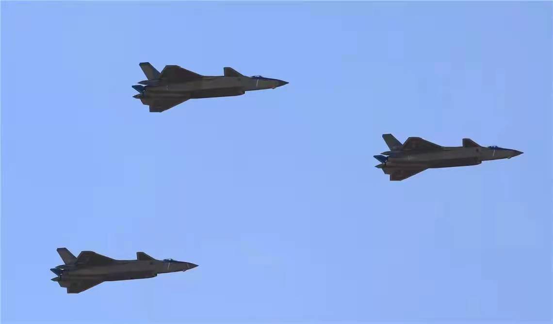 在朱日和训练基地,3架歼-20战机组成楔队咆哮而过,以战斗姿态接受检阅。