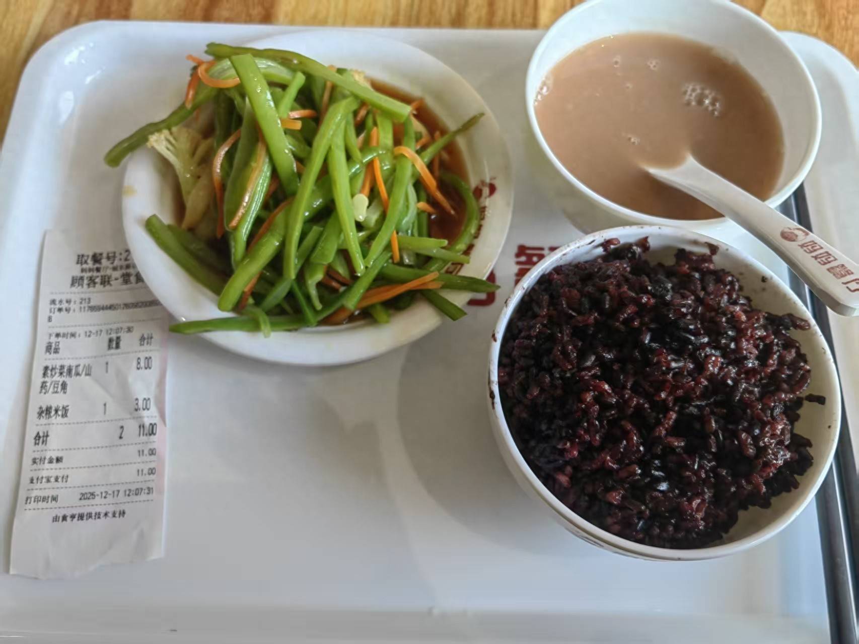 一份双拼素炒菜8元,一份炒面10元,一份杂粮米饭3元,汤免费……